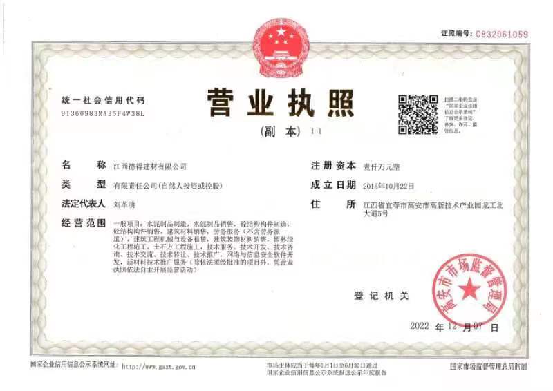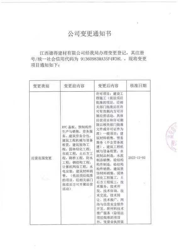 為利于公司更好的專業(yè)化發(fā)展,擴大公司在RPC(UHPC)行業(yè)影響力,公司正式更名為“江西德得建材有限公司”。